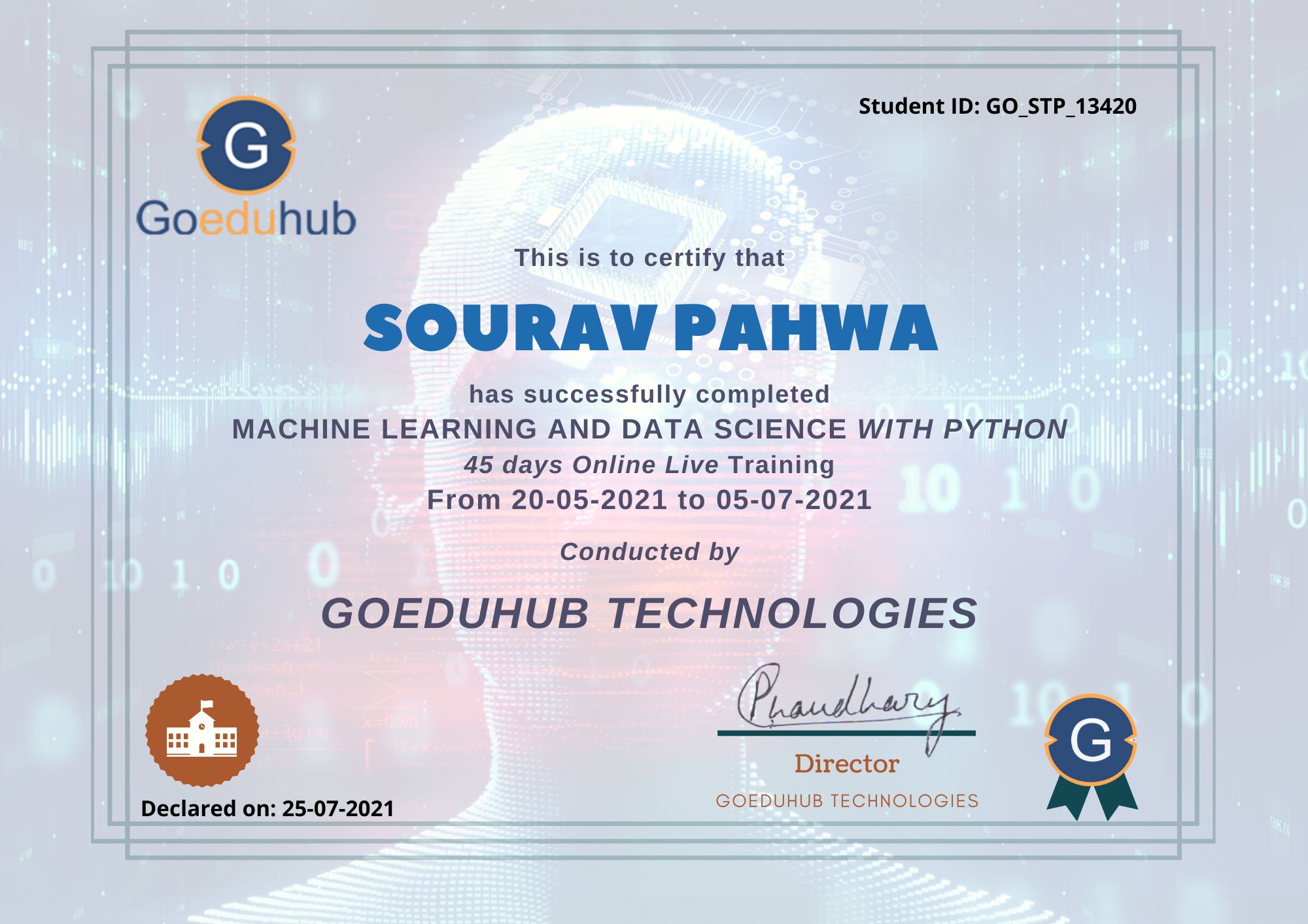 Completed 45 days Machine Learning with Python Training at Goeduhub Technologies.